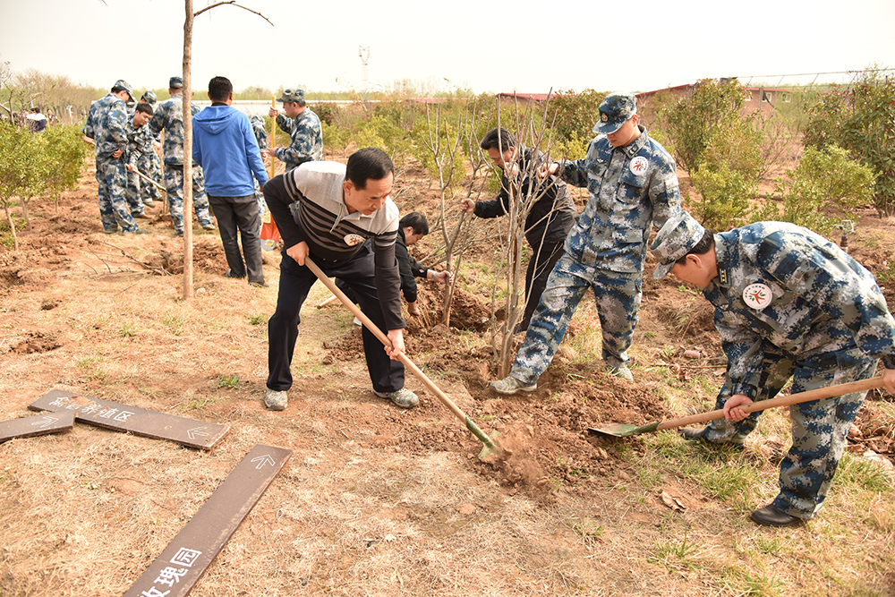 植树现场大家繁忙有序、干劲十足,在技术人员专业指导下,一部分同志穿戴各自的工装、迷彩服,挥舞着自己的队旗,佩戴着“造绿济南,志愿奉献”的LOGO徽标,铲土挖坑、扶苗栽树;还有一部分同志对去年栽种的100多棵北美海棠树进行培土、浇水、剪枝,并对周边的垃圾进行拾捡清理为内容的“回头看”劳动。在大家共同努力下,经过一个半小时的忙碌。共栽植近200余棵木槿树。