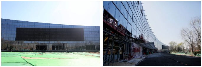 项目建成后,主入口位于展馆西侧的共享大厅,南北向的5个展馆通过共享大厅相通,目前共享大厅的玻璃幕墙已安装完毕,每块玻璃都按照固定编号依次安装,不同弧度的玻璃面完美拼接,将大厅的流动设计感尽显无疑。共享大厅外立面的LED大屏颇为抢眼,高约8米、长约43米的LED大屏日后将用于不同展馆布展介绍情况等宣传使用。在室外部分,正在进行广场绿化和管道铺设等施工,工人们有条不紊地完善着室外施工细节。