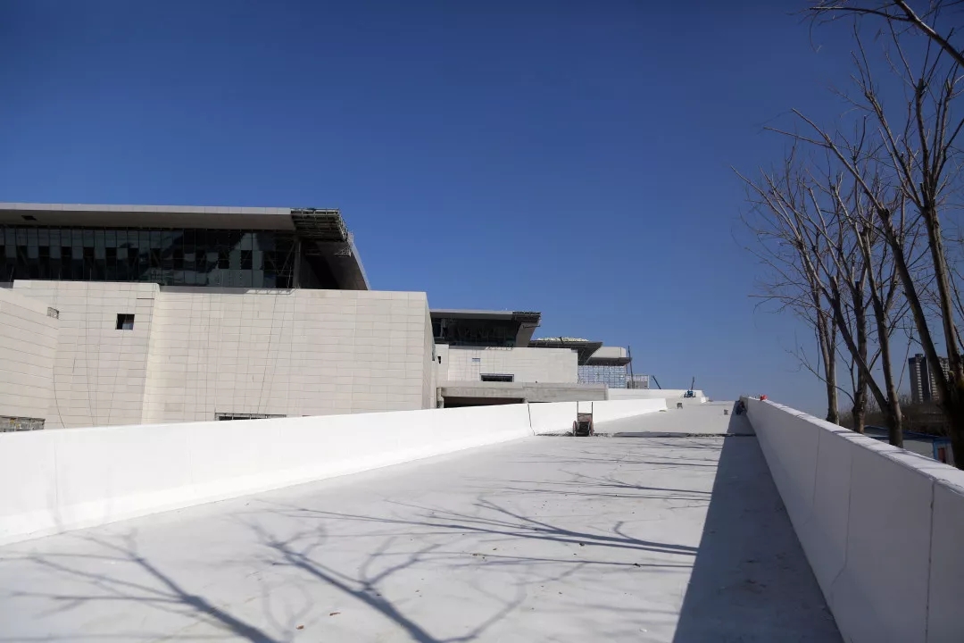 五个展馆中,2号馆与3号馆为二层展馆,施工最为复杂的1号馆为三层,为便于布展,卸货平台将与展馆紧密相连,车辆可通过卸货平台直接进入展馆的二三层卸货,方便二层展馆布展,目前卸货平台已完成主体结构施工,正在进行装饰及安装工程施工。据了解,该卸货平台的匝道桥坡度为7%(1米上升7公分),为济南坡度最陡的匝道桥,出于安全因素考虑,按设计将采用只上不下的通行方式,车辆可由卸货平台上达展馆二三层,后由北侧的旋转通道下行。