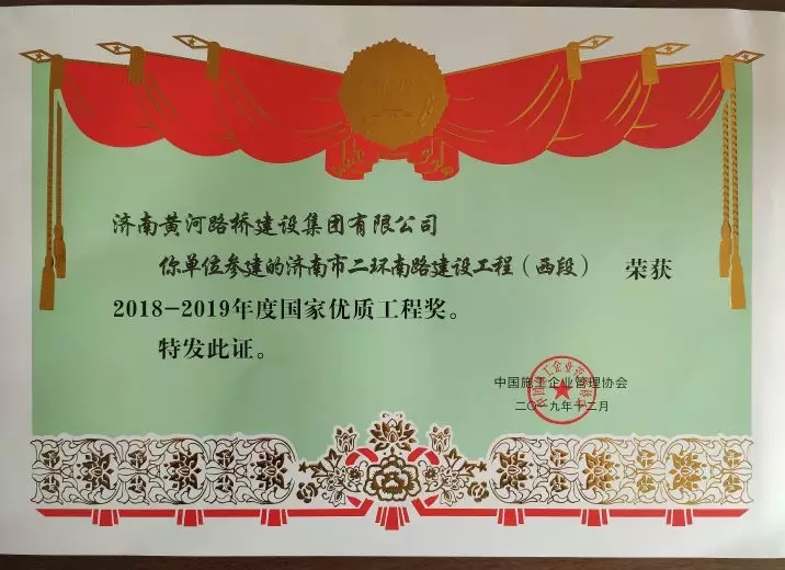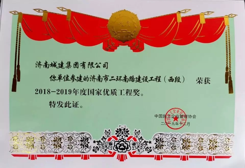 有限公司、济南城建集团有限公司分标段承建的济南市二环南路建设工程(西段)荣获“2018-2019年度国家优质工程奖”。