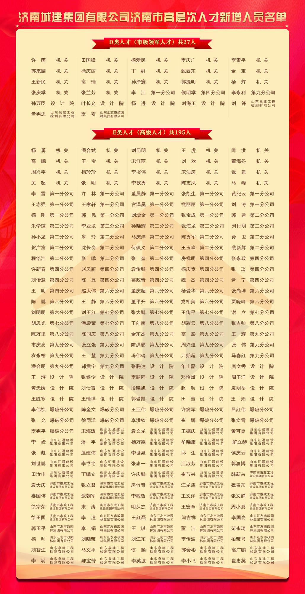 近期,济南市高层次人才分类认定2020年第五批审核结果公布,城建集团新增市级领军人才(D类)27人,高级人才(E类)195人。